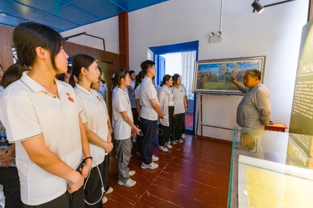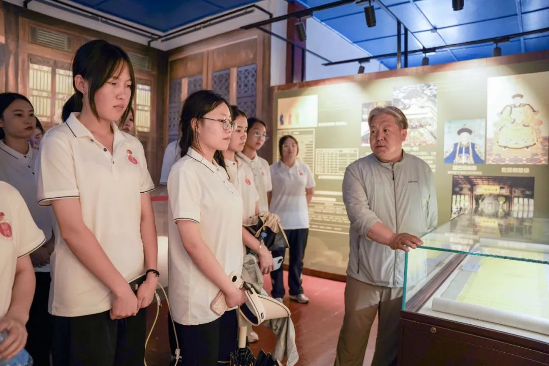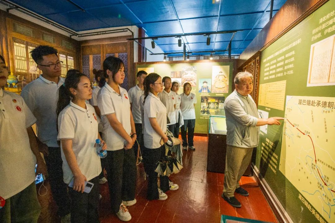在参观过程中,实践团成员跟随讲解员的引导深入探索了王府的历史变迁与建筑特色。一件件文物、一幅幅图片、一幕幕黑白影像定格的历史瞬间,无声诉说着历史洪流中,土尔扈特部西迁后在伏尔加河畔生存繁衍、外御强敌、东归故里的壮举。这些历史片段不仅揭示了该部落在开发与稳定中国西北边疆、维护国家统一、促进民族团结等方面所做出的显著贡献,也反映了其在历史长河中的重要地位。